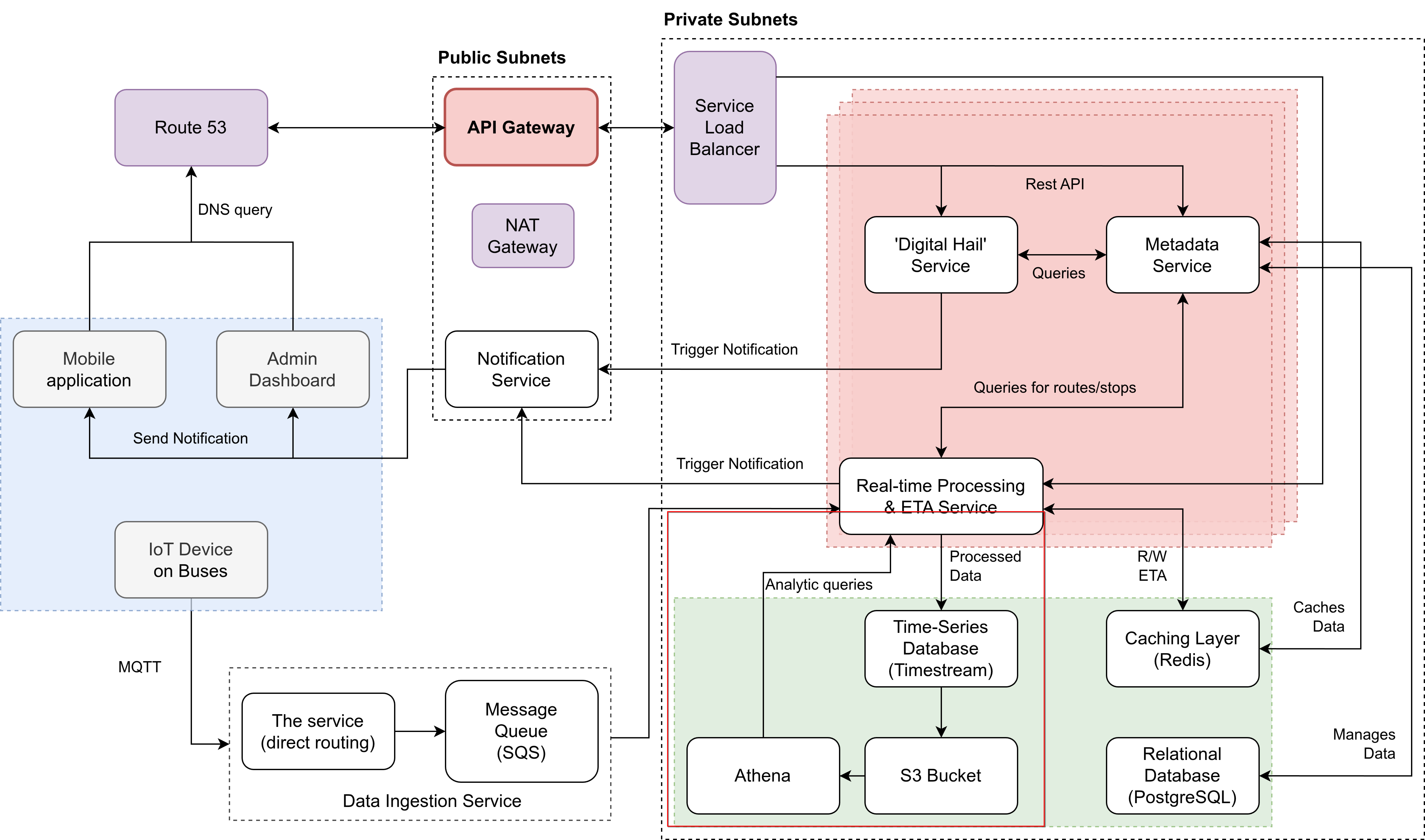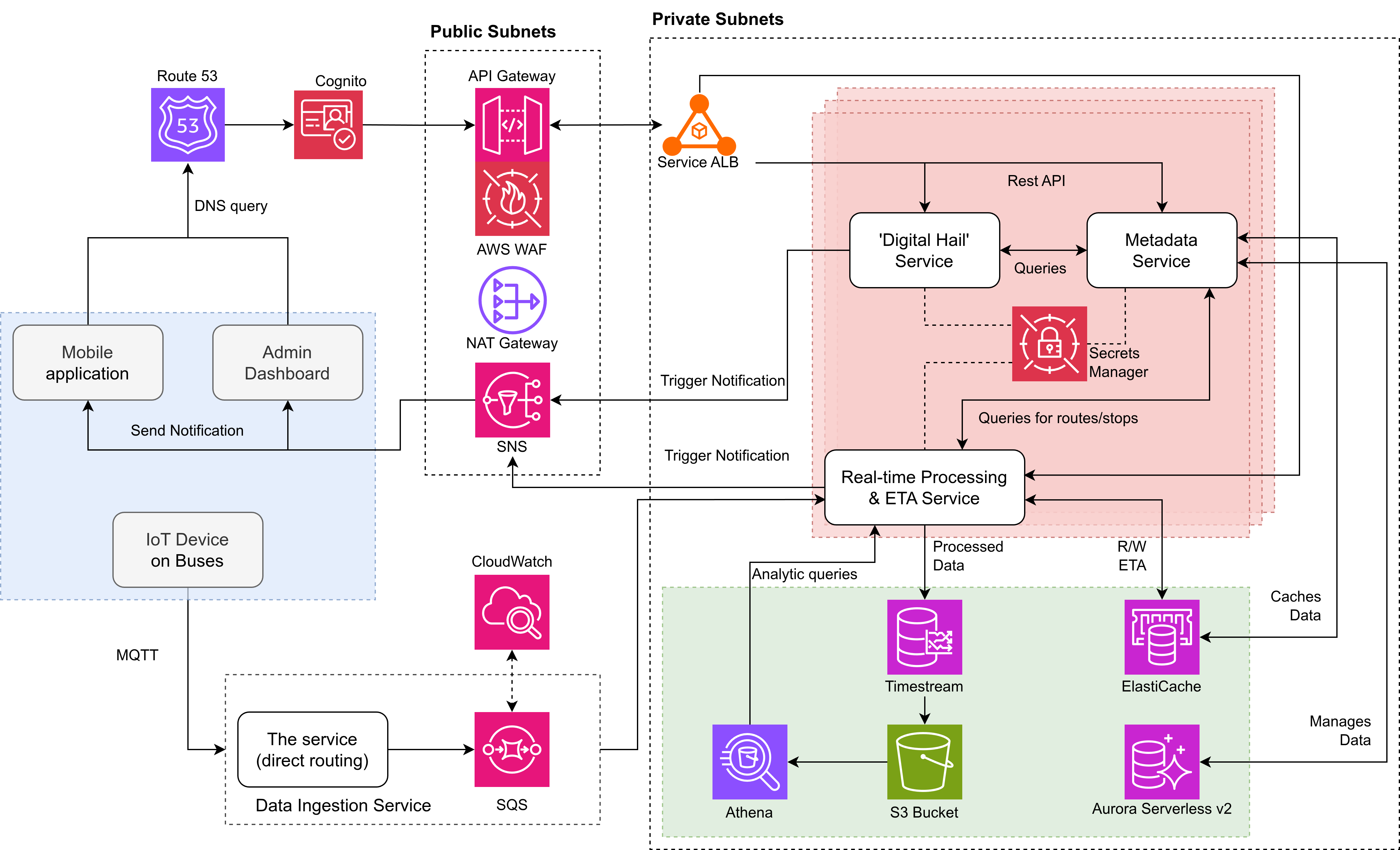 Buses publish to a standard MQTT topic (e.g., bus/location). The Message Broker charges for receiving it, then the Rules Engine charges to route it. We can configure buses to publish to a reserved topic, for example:$aws/rules/RouteToSQS/bus/location.