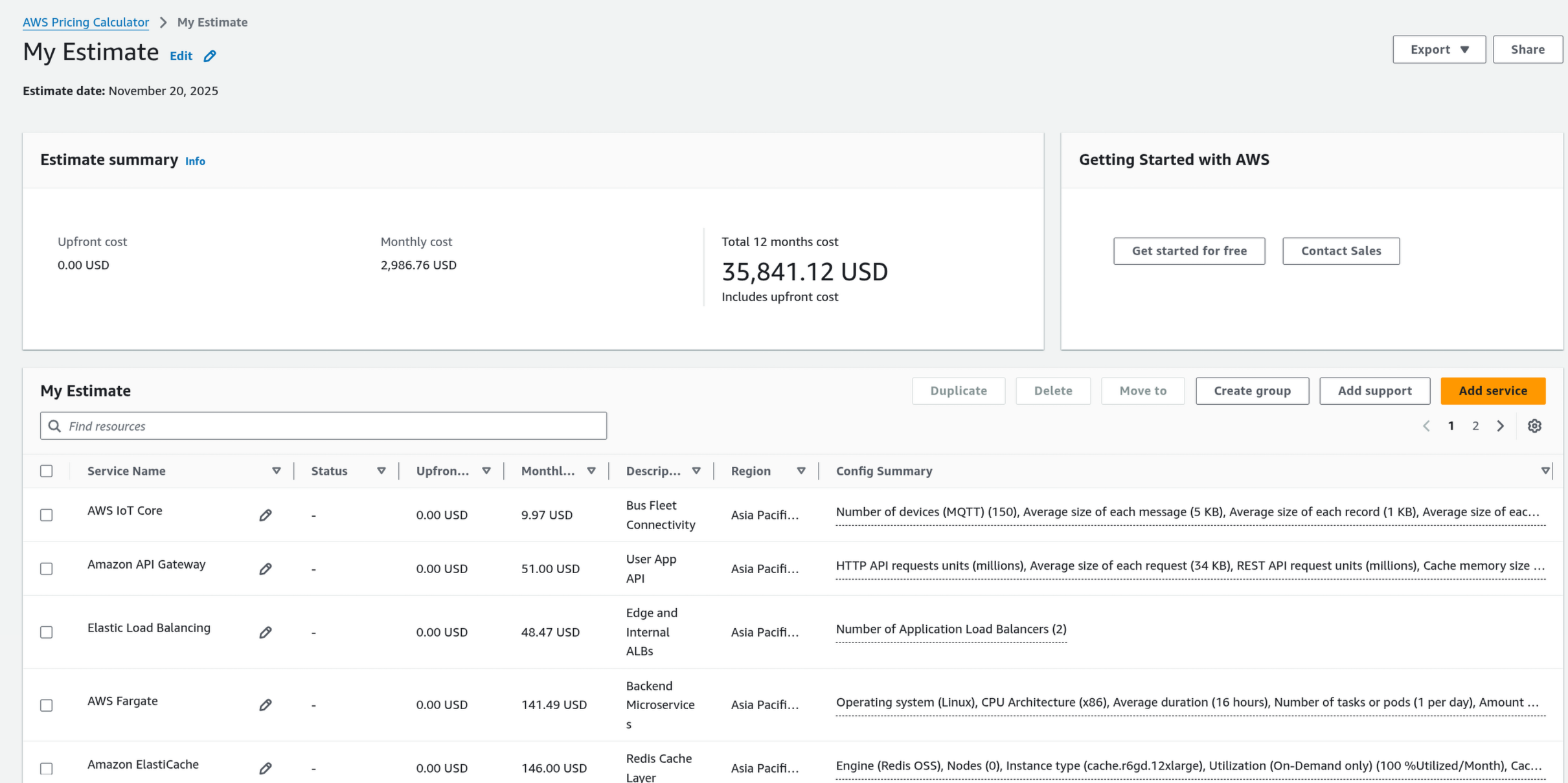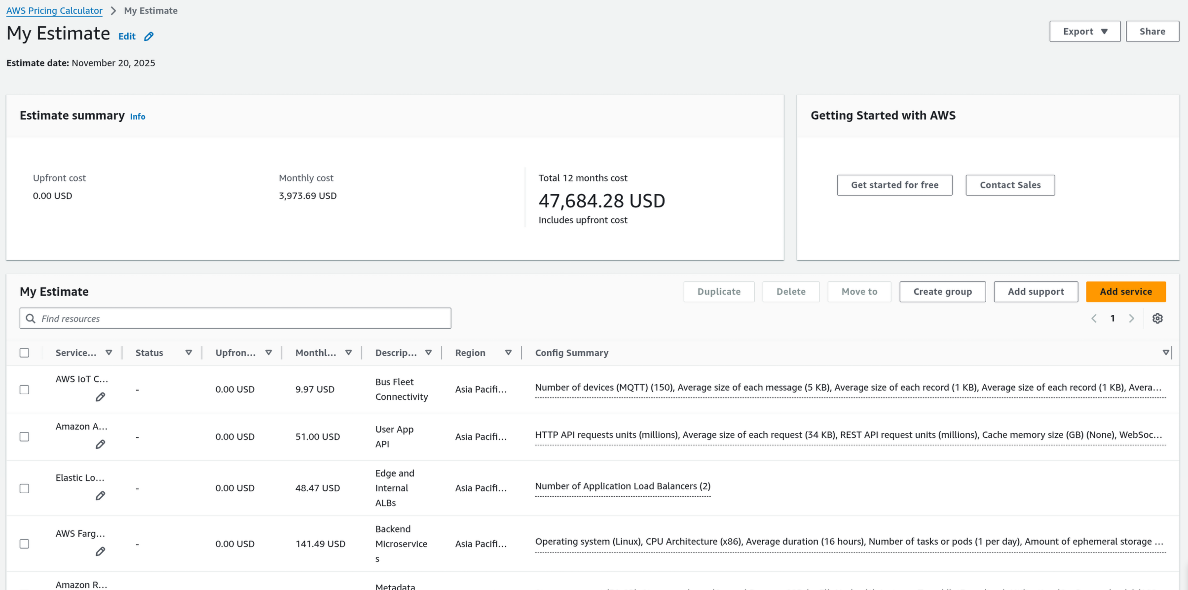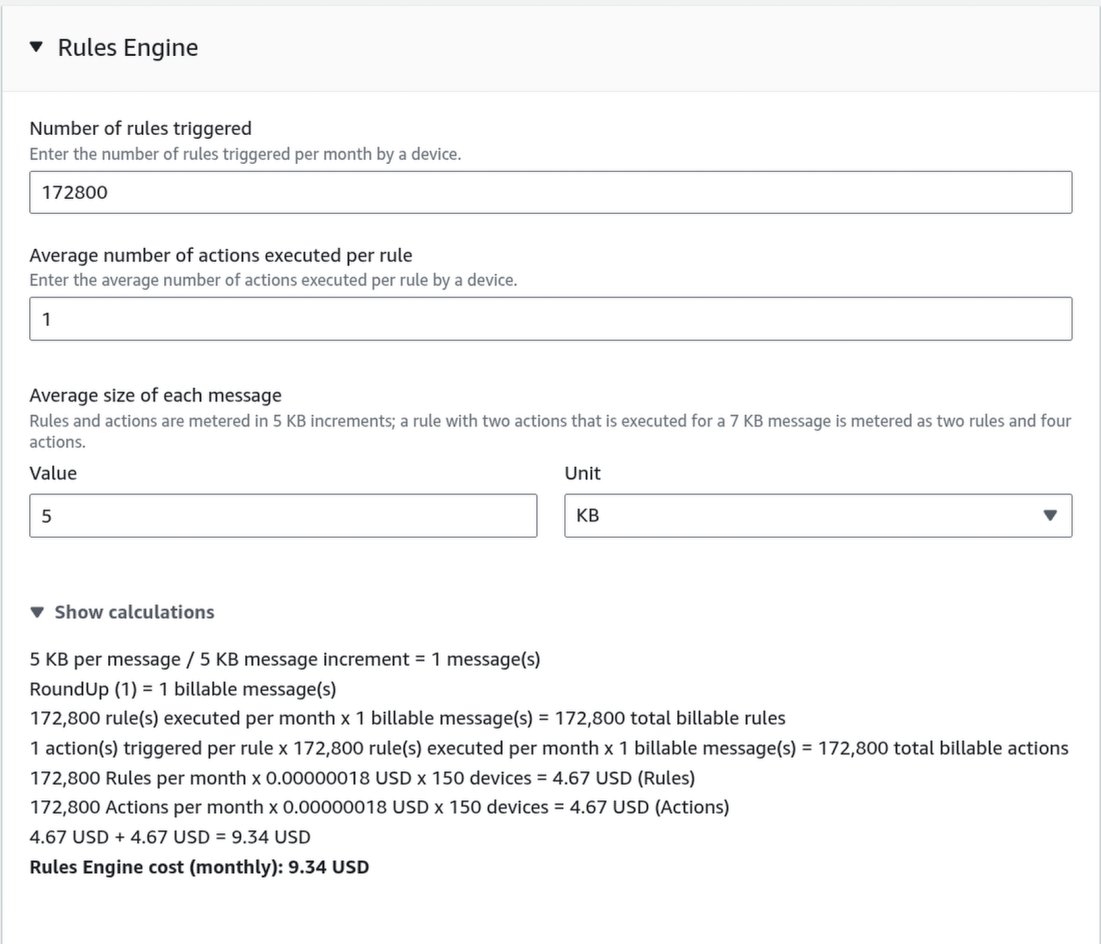 26,000,000as the “Number of messages for a device”. In Reality: 150 buses 1 msg/10s 26 million messages TOTAL for the whole fleet, not per device. You are currently pricing the system as if you have 3.9 Billion messages per month. The correct message value is: